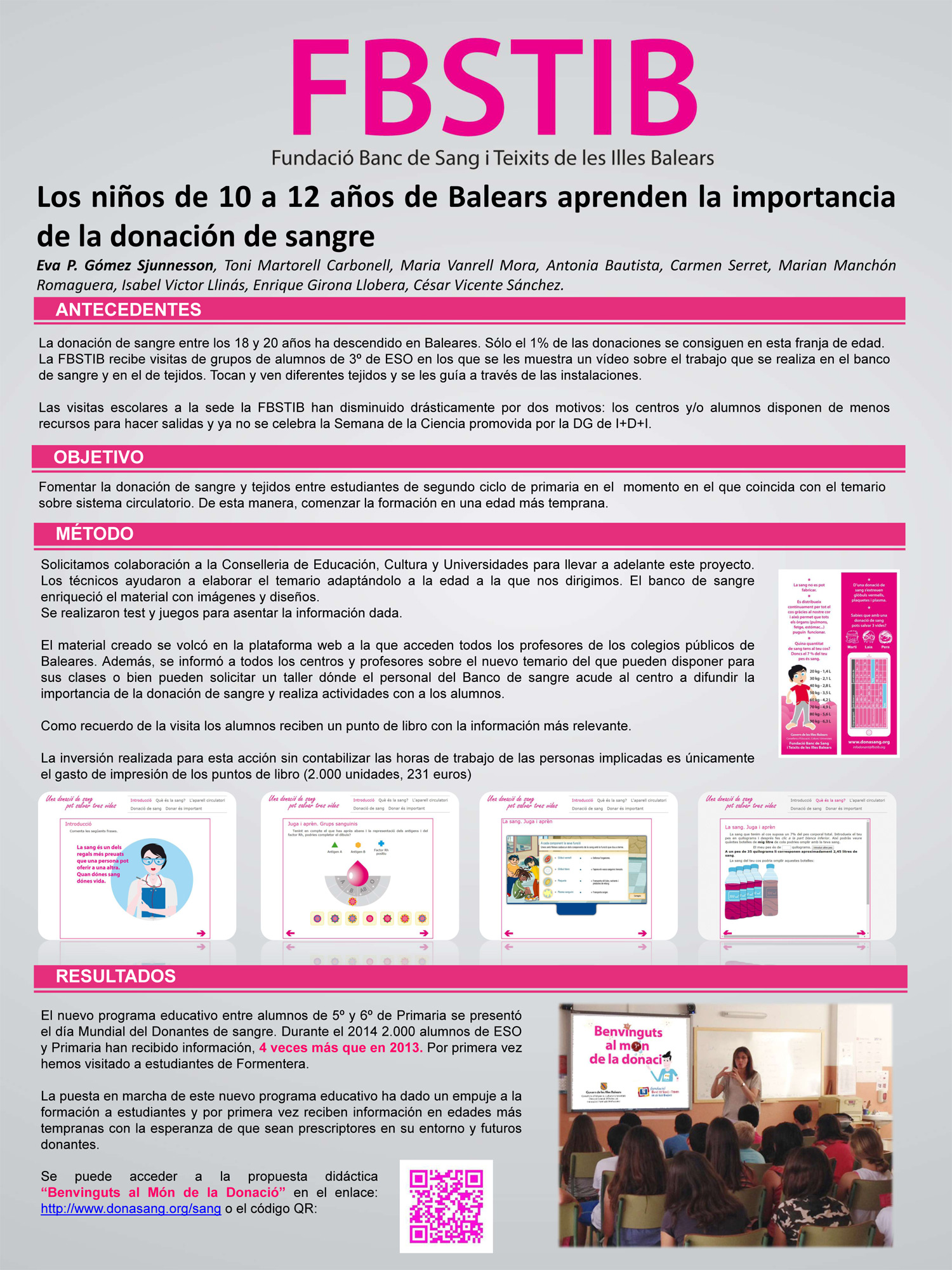 La segona de les comunicacions “Els nens de 10 a 12 anys de Balears aprenen la importància de la donació de sang” en format pòster es refereix al Nou Programa Educatiu “Benvinguts al Món de la Donació” per a tots els alumnes de 5º i 6º de Primària de les Illes Balears realitzat amb la col·laboració de la Conselleria d'Educació, Cultura i Universitats gràcies la qual s'ha donat un impuls a l'educació sobre la donació de sang i teixits multiplicant per quatre les xerrades educatives a alumnes de diferents centres educatius. Més de 2.000 alumnes han rebut informació sobre la importància de donar sang, i per primera vegada s'han visitat centres a Formentera.
