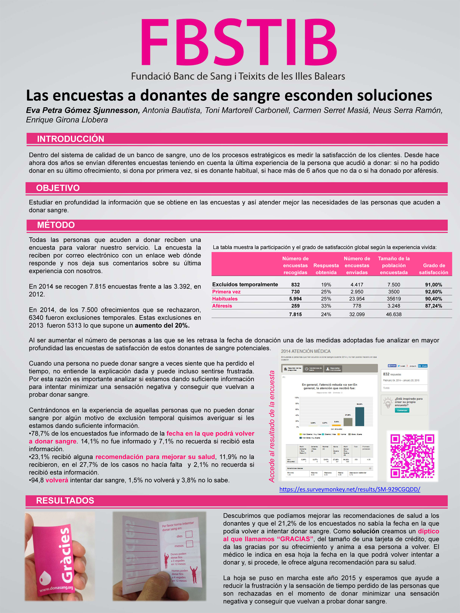 La tercera comunicació “Les enquestes a donants de sang amaguen solucions” presenta l'estudi en profunditat de la informació que s'obté en les enquestes a les persones que acudeixen a donar sang del que es va detectar una oportunitat de millora en la informació a les persones que no poden donar ja que el 21,2% dels enquestats no sabia la data en la qual podia tornar a intentar donar sang. Com a solució es va crear un díptic que dóna les gràcies pel seu oferiment i anima a aquesta persona a tornar. El metge li indica en aquesta fulla la data en la qual podrà tornar intentar a donar i, si escau, li ofereix alguna recomanació per a la seva salut.